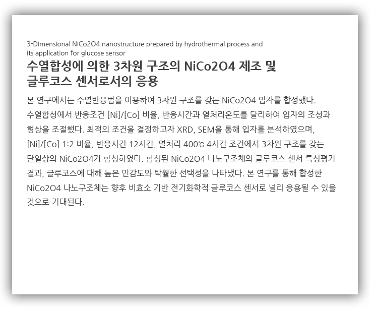 본 연구에서는 배터리, 촉매, 센서 등에 사용되는 NiCo2O4 를 수열합성 후 열처리하여 3차원 나노구조체를 갖는 NiCo2O4 산화물을 제조하였다. NiCo2O4 의 형상은 수열합성 [Ni]/[Co] 1:2 비율, 반응시간 12시간, 열처리 조건 300℃ 4시간 이상 조건에서 단일상의 NiCo2O4 가 합성되기 쉬웠고, 합성된 NiCo2O4는 Nanoplate가 응집 되어 있는 3차원 구조체 형태를 가지며 합성조건별로 형상의 변화를 관찰하였다. 합성된 NiCo2O4 나노구조체 에 대한 글루코스 센서 특성평가 결과, 글루코스에 대한 민감도는 약 95.051 ㎂/㎠ mM(R2 = 0.998)으로 최대 5mM의 글루코스 농도까지 선형적으로 측정되었다. 본 연구를 통해 수열합성법으로 합성한 NiCo2O4 나노구조 체는 향후 비효소 기반 전기화학적 글루코스 센서로 널 리 응용될 수 있을 것으로 기대된다.