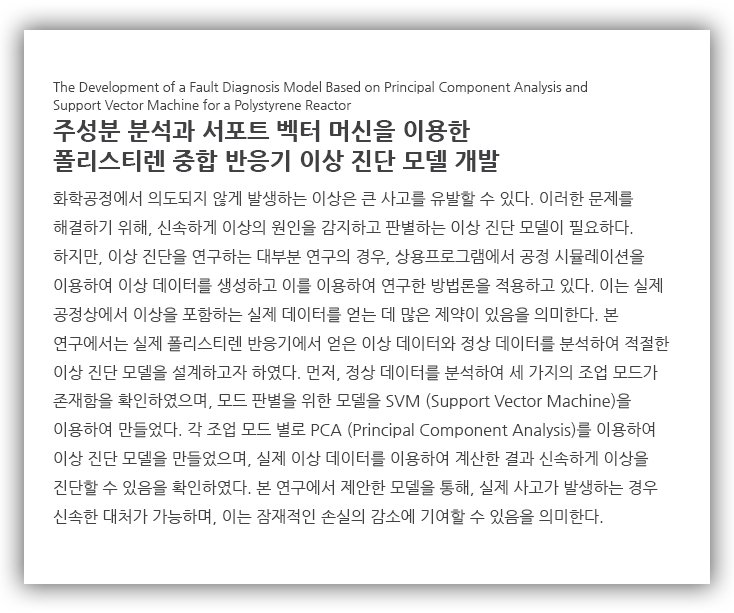 본 연구에서는 실제 폴리스티렌 중합 공정에서 발생한 사고 데이터를 이용하여 SVM과 PCA에 기반한 이상 진단 모델을 제안하였다.