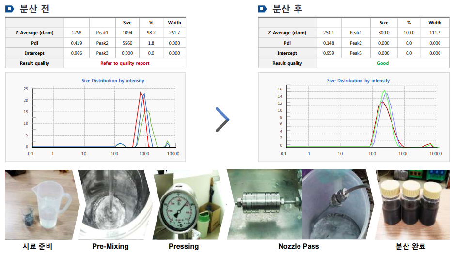 초고압 분산기 '나노 디스퍼져'는 Orifice Module의 원리를 이용한 Diacell에서 고압의 유체가 가속되어 발생하는 전단력(Shear)과 충격(Impact), 케비테이션(Cavitation) 작용이 수반되며 균질성 및 분산성이 좋은 제품이 만들어 집니다.