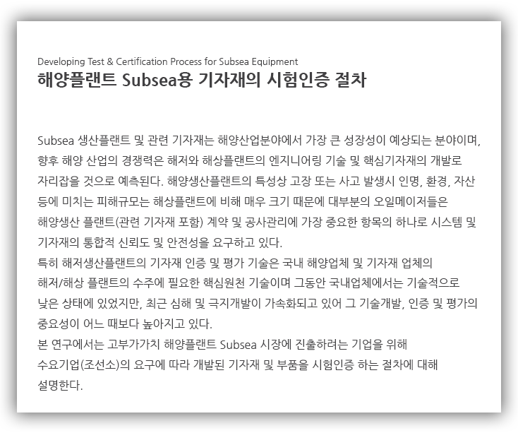 특히 해저생산플랜트의 기자재 인증 및 평가 기술은 국내 해양업체 및 기자재 업체의 해저/해상 플랜트의 수 주에 필요한 핵심원천 기술이며 그동안 국내업체에서는 기술적으로 낮은 상태에 있었지만, 최근 심해 및 극지개 발이 가속화되고 있어 그 기술개발, 인증 및 평가의 중요성이 어느 때보다 높아지고 있다. 본 연구에서는 고부가가치 해양플랜트 Subsea 시장에 진출하려는 기업을 위해 수요기업(조선소)의 요구에 따라 개발된 기자재 및 부품을 시험인증 하는 절차에 대해 설명한다.