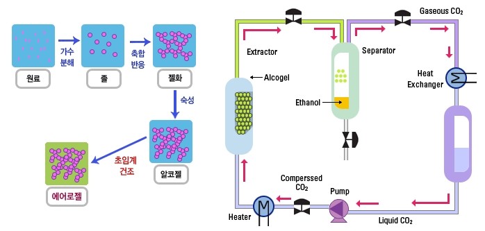 부피의 98%이상이 기체로 되어있는 에어로젤은 젤형태에 가장 가까운 고체로, 초임계 건조를 통해 젤의 고체 구조를 유지하며 내부를 기체로 채워 물질을 얻어낼 수 있습니다.