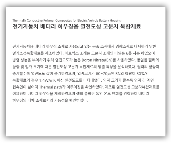 동일한 BN 필러의 경우 입자사이즈가 클수록 열전도도가 증가함을 확인하였으며 이는 Thermal path가 입자가 클수록 잘 이루어짐을 알 수 있었다. 제조된 복합재료를 이용하여 제작된 배터리 하우징에 대한 온도변화는 배터리 충전 및 방전 초/중기까지는 온도변화가 거의 없다가 시험 종료시에 온도변화가 보였으나, 최대온도는 30℃이하로 온도 변화가 낮아 금속 대체 소재로 가능성이 있음을 확인하였다.