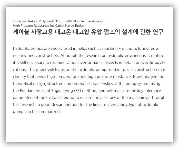 본 연구에서는 유압 펌프 시스템의 주요 치수를 경험 수식으로 계산하여 모델을 설정한 후 유한 요소 시뮬레이션으로 유압 펌프 구성 요소의 구조적 강도와 열 특성을 분석하게 되었다. 마지막 측정 테스트를 통해 제품 가공의 정확성을 확보할 수 있었다.