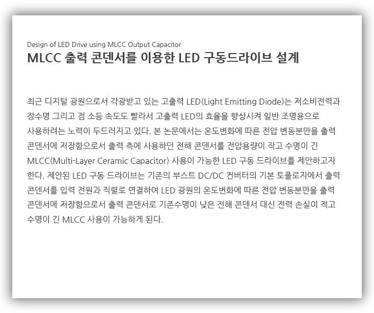 본 논문에서는 병렬회로수가 많은 대용량 조명용 LED 광원을 구동하기 위해 사용되는 LED 구동드라이브에서 온도 변화에 따른 정 전류 보상을 위한 새로운 방법을 제안하였다. 기존의 온도 변화에 따른 정전류 보상을 위한 전력 변환기의 경우에는 Boost 컨버터를 이용한 정전류 제어를 주로 사용하였다. Boost 컨버터를 이용한 LED 구동 드라이브 설계시 전류 검출을 위한 검출 저항을 채널에 직렬 연결하게 됨으로서 전력 손실이 발생한다.