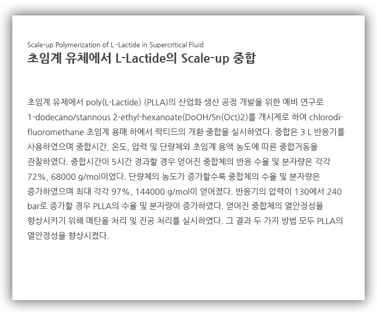 초임계 물질로 가장 많이 이용되는 Co2는 임계 조건에 쉽게 접근할 수 있으며 불연성, 화학적으로 안전합니다. 임계온도가 낮기 때문에 용질의 성분이 변질되지 않아 열변성 물질의 저온공정(의약품, 식품 추출)에 적합하며 화장품, 화학, 에너지 산업 등 친환경 공정기술로 많은 곳에서 사용되고 있습니다.