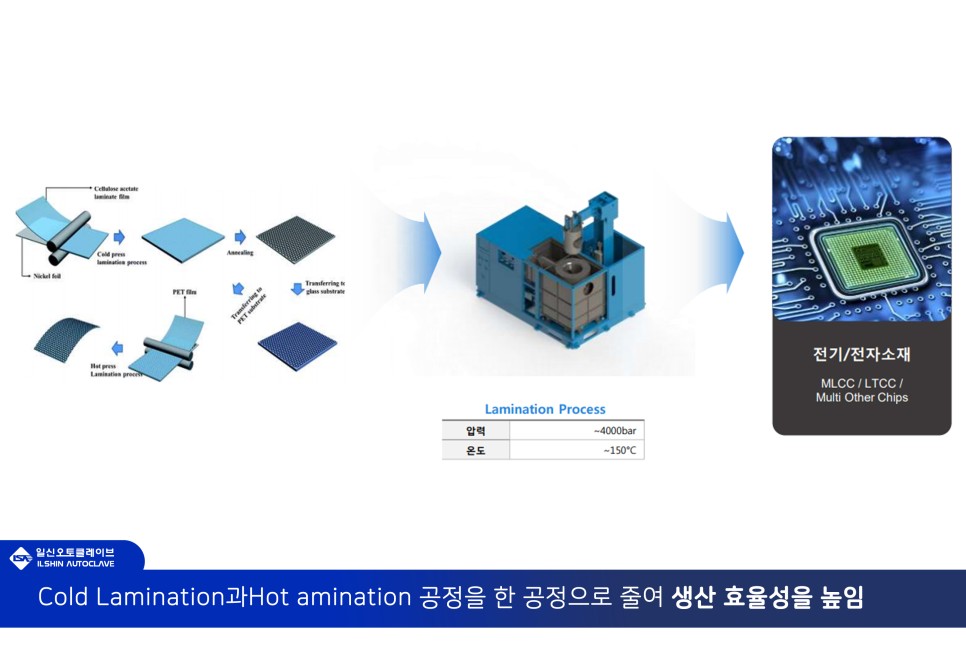 온간 정수압 프레스(WIP)는 온도의 물성 변화가 필요한 제품을 목표 온도에서 고압 및 압착 처리 공정을 진행하는 설비 압축 유체로, 사용하는 물은 최대 90도까지 사용 가능하며 그 이상의 온도는 밀도 변화가 적은 오일을 사용합니다. 열간 정수압 프레스는 Clod Lamination 공정과 Hot Lamination 공정을 한 공정으로 줄여 생산의 효율성을 극대화한 것으로 전기, 전자 소재(MLCC, LTCC), Multi Other Chips 등에 주로 사용됩니다.