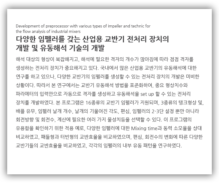 특히 대부분의 산업용 교반기에서 사용되는 회전 날개형 교반기를 대상으로 날개의 형상이나 개수에 따른 교반 효과에 대해 많은 연구가 진행되어 왔다.