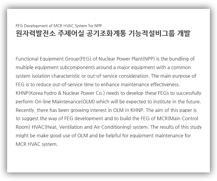 지금까지 한국표준형 원자력발전소의 주제어실공 기조화계통에 대하여 가동중정비를 목적으로 하는 기능적설비그룹(FEG)의 단계별 개발내역과 수행결과를 설명하고 그 방법을 제시하였다. 주제어실 공기조화 계통은 원자력발전소 주제어실 지역에 거주성을 보장하도록 환경조건을 유지시키는 계통으로서 화장실/주방 배기기능을 제외하고 모두 두 개의 다중계열로 구성되며 각 계열은 전체용량을 100% 처리 할 수 있도 록 되어있다.