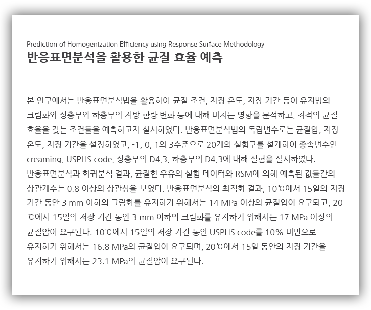 Pandolfe(2005)의 기준에 의하면 10~12일의 유통기한인 우유의 D4,3은 0.88~0.80 μm이지만, 10 MPa의 D4,3은 1.007 μm로 10일의 유통기한도 불가능하다. 20 MPa의 D4,3은 0.690 μm으로 16~20일의 유통기한이 가능하고, 30 MPa의 D4,3은 0.555 μm로 21~30일의 유통기한이 가능하다.