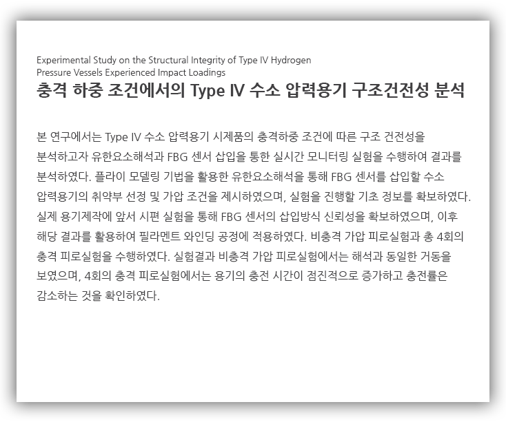 본 논문에서는 Type IV 수소 압력용기 시제품에 FBG 센서를 삽입하여 충격하중에 대한 용기의 구조 건전성 변화를 분석하였다.