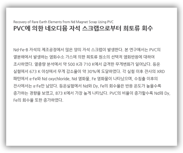 4) 염화반응에 의한 희토류 원소의 회수율은 염화반응 온도가 증가할수록 높아졌으며, 873 K, 1시간 실험에서 네오디뮴의 회수율은 약 50%로 가장 높게 나타 났다. 그리고 PVC 첨가량이 증가할수록 염화반응에 의한 희토류 원소의 회수율이 증가하였다.