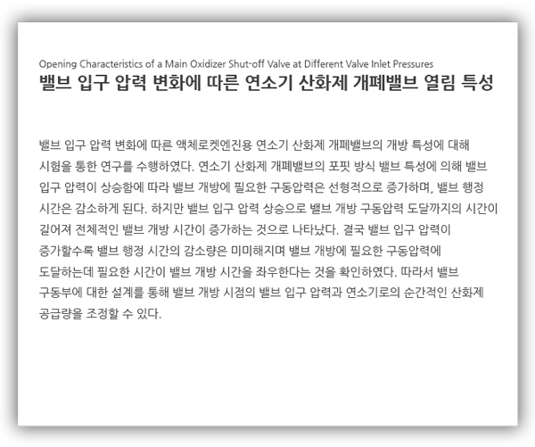따라서 엔진 시동 설계의 높은 신뢰성을 확보하기 위해서는 추진제 공급 특성을 결정짓는 개폐밸브들의 밸브 개방 특성에 대한 정확한 이해가 필수불가결하다고 할 수 있다.
