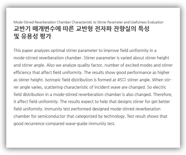 교반기의 매개변수 변화에 따른 전자파 잔향실의 전계균일도 경향 및 전계균일도에 영향을 미치는 것으로 알려진 Quality Factor, 여기 모드 수, 교반기 효율을 분석한 결과 교반기 높이가 증가함에 따라 특성이 향상되었으며, 45 °의 교반기 각을 가질 때 축별 전계강도 편차가 가장 작게 나타 나 전자파 잔향실 내부가 등방성에 가까운 전계분포를 형성 한다는 것을 확인하였다. 따라서 교반기 각이 45 °이면서 교반기 면적이 넓을수록 향상된 전계균일도를 확보할 수 있는 것으로 보이며, 이는 넓은 교반기 면적에 입사되는 전자파가 보다 다양한 산란각을 형성하게 되어 전계균일도 향상에 기여하기 때문으로 판단된다. 이렇게 설계된 교반기를 이용하여 반도체 소자에 대한 반도체 피해효과 실험을 수행한 결과, 기존에 수행된 반도체 소자에 대한 반도체 피해효과 실험 결과에 비해 보다 정량적이고 재연성 높은 결과를 나타내었다. 따라서 교반형 전자파 잔향실이 전자파 내성평가를 위한 대체 시험시설로 사용할 수 있음을 확인하였다.