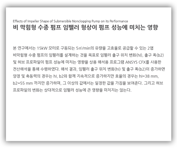 비 막힘형 수중 슬러리 펌프(non-clogging type of submersible slurry pump)는 주로 고상의 입자가 상당수 포함된 액체를 수송하는 용도로 사용하는 펌프이다. 이러한 슬러리 펌프의 경우 사용 용도에 따라 낮은 비속도(specific speed)에서도 큰 고형물을 고 효율로 이송할 수 있어야 되나 기존의 원심펌프 설계방법으로는 임펠러의 유로 폭이 매우 좁아져 큰 고형물을 이송하는 것이 불가능해 진다는 문제점이 발생한다. (1~3) 최근 이러한 분야에 대한 몇몇 연구가 학계에서 이루어지고 있으나 아직 산업 현장에 적극적으로 적용되지는 못 하고 있는 실정이다. (4,5)