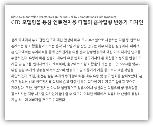 본 연구 결과로부터 디자인된 흡착 탈황 반응기는 선박 연료전지용 디젤의 탈황기술에 이용될 수 있으며, 기존 연료전지의 크기를 효과적으로 감소시키고 효율을 크게 높일 수 있을 것으로 기대된다. 또한, 향후 탈착 반응 등을 추가로 고려 함으로써 열 순환식 흡착(Thermal Swing Adsorption) 기술을 [13] 활용하여 연속적으로 흡착-재생을 반복하는 전체적인 탈황 프로세스 개발에 이용될 것이다. 이러한 연료 정제 시스템의 개발은 국내의 화공장치, 조선, 철강, 건설, 전자 IT 산업 등을 포함하는 국내 세계 일류 산업 인프라와 연계시켜 원자 재 및 공정의 국산화를 통해 최종 제품의 기술 완성도와 경제성을 향상해 수입품 대체 및 수출 산업으로의 육성을 가능하게 할 것이다.