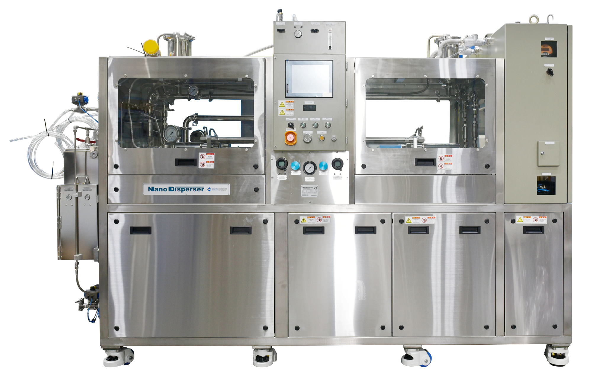 고압분산기 양산형 나노디스퍼져 NH 시리즈는 비가동시 원료의 고형화 방지를 위한 용액 저장 탱그 및 자동밸브를 장착하고 있으며 장비 정면에 위치하고 잇는 메인 터치패널 스크린을 통해 운전 중 설비의 가동상태를 파악, 경보기능을 통해 문제 발생 시 신속하게 대처가 가능하다는 장점을 지니고 있습니다. 또 내부 Seal의 수명유지를 위해 증압기 부분에 냉각라인이 설치되어 마찰열에 의한 손상을 최소화 할 수 있도록 설계 및 제작되었고 Back Flushing System으로 챔버(Chamber)의 막힘 현상 발생 시 편리한 세척이 가능합니다.