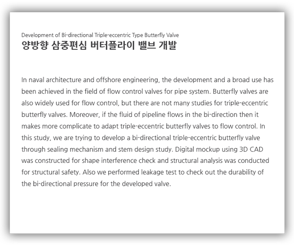 ① 선박, FPSO 및 해양플랜트에 사용 가능한 양방향 삼중버터플라이 밸브를 개발, 검증하였다.