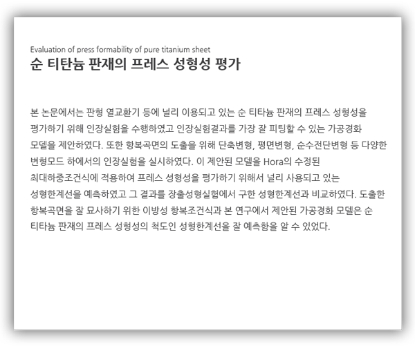 본 논문에서는 판형 열교환기 등에 널리 이용되고 있는 순 티타늄 판재의 프레스 성형성을 평가하기 위해 인장실험과 장출성형실험을 수행하여 다음과 같은 결과를 도출하였다.
