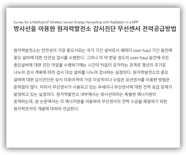 원자력발전소는 기기의 파손 사고로 인해 발생할 수 있는 막대한 피해를 미연에 방지하기 위한 감시진단 기술을 지속적으로 도입하여 적용하고 있는데, 원자력발전소의 특성상 감시진단을 위한 센서의 배치와 센싱 데이터의 수집이 매우 어려운 경우가 빈번하게 발생하고 있다. USN과 WSN이 활발하게 연구되어 실용화되고 있는 현재에도 센서들의 통신, 특히 무선 통신으로 인한 주변기기의 오작동 사고 발생 우려로 원자력발전소의 주요 안전기기에 대한 무선센서의 적용에 어려움을 겪고 있다. 그러나 미국의 샌디아랩을 비롯하여 여러 원자력관련 기관에서 이미 무선센서의 원자력발전소 적용 방안과 기술을 개발하기 시작하였고, 향후 수년 내에 인증된 무선센서들과 이를 이용한 센서 네트워크가 구현될 것으로 예상된다.