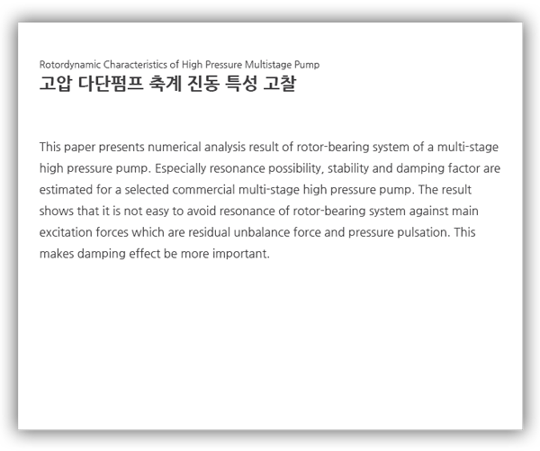 본 논문은 고압다단펌프 축계의 정적 상태 및 동적 상태를 수치해석하고, 해석결과로부터 정적상태의 위험요소와 동적상태의 위험요소를 평가한다. 대상기기는 현재 상업적으로 판매되는 고압다단펌프를 그 대상으로 한다.