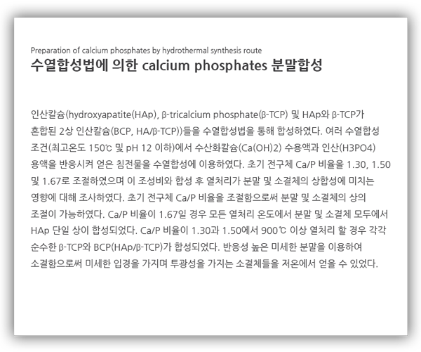근래에 생체친화성이 우수하고 강도 또한 금속이나 고분자에 비해 뛰어난 세라믹 생체재료에 대한 관심과 연구가 활발히 진행되고 있다. 가장 널리 사용되는 생체친화성 세라믹 소재로는 인산칼슘(CP, Calcium phosphate) 계로 Ca/P 비가 1.67인 수산화아파타이트(HAp, Ca10(PO4)6(OH)2))와 Ca/P = 1.5인 β-tricalcium phosphate(β-TCP, Ca3(PO4)2) 등이 있다[1,2]. Ca와 P를 주성분으로 하는 인산칼슘계열은 골 미네랄과의 화학적 구조적 유사성으로 인해 골 조직 재생을 위한 효과적인 대체재로 여겨지고 있으며 그중 수산화아파타이트계 세라믹은 생체활성 재료의 기본 조성으로 인공 골로써 그 유용성이 높게 평가되고 있 으며, β-TCP는 생분해성이 높은 소재로 골 대체제 등 다양한 분야에서 사용되고 있다[1-4].