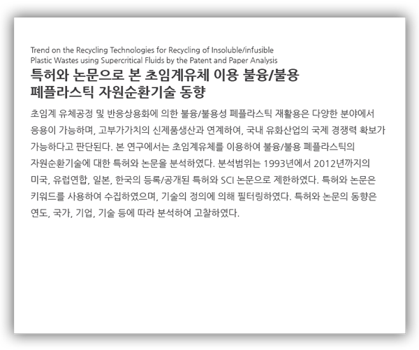 특정 주제에 대한 연구에 앞서, 특허 및 논문 분석에 의한 기술동향 파악은 기존에 수행되었던 관련 기술들의 연구내용 뿐만 아니라, 향후 연구의 방향을 설정하기 위한 중요한 자료로 활용되고 있으며, 연구내용이 중복되는 것을 사전에 막아주는 역할을 한다. 이에 본 연구에서는 초임계유체를 이용하여 불융/불용 폐플라스틱의 자원순환기술에 대하여 일본, 한국, 미국, 유럽의 특허정보와 논문정보를 분석함으로서 기술의 동향을 고찰하였다.
