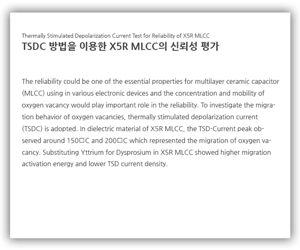 X5R의 MLCC 유전체 조성에서 Dy 자리에 Y를 0, 40, 60, 100% 치환한 시편의 TSDC를 측정하였다. 이 결과 당사의 X5R 유전체 조성에 대해서 150℃ 부근과 200℃ 부 근의 peak으로 산소공공의 이동 거동을 확인하였다. Dy+Y 의 조성 변화 실험 결과로 Dy나 Y 단독 조성에 비해 Dy+Y 혼합 조성의 산소공공의 이동을 야기하는 activation energy가 높고 defect의 농도가 낮을 것으로 판단되었다. 이는 Dy50-Y50 조성의 chip의 가속수명시험 결과 신뢰성이 더 높았던 결과와 일치한다.