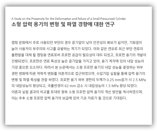 본 연구에서는 하부 경판의 곡률반경 및 두께 변화 에 따른 프로판용 소형 압력용기의 변형 및 파열 양상을 관찰하였다. 이론적인 응력해석 결과와 실험결과를 비교하여 그 경향성을 확인하고자 하였으며, 본 연구를 통해 얻은 결론은 다음과 같다.