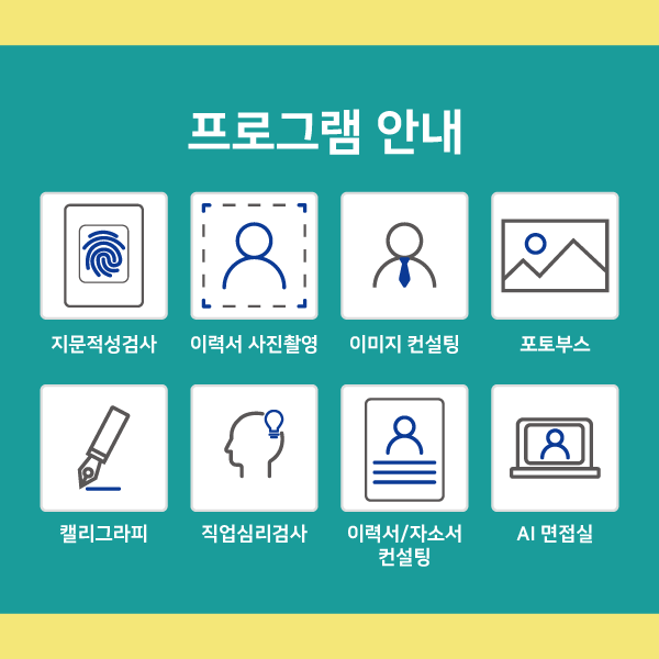 지문 분석을 통한 진로 상담과 이력서 사진 촬영, 헤어/메이크업/표정 등의 컨설팅 지원, 인생네컷 사진촬영,