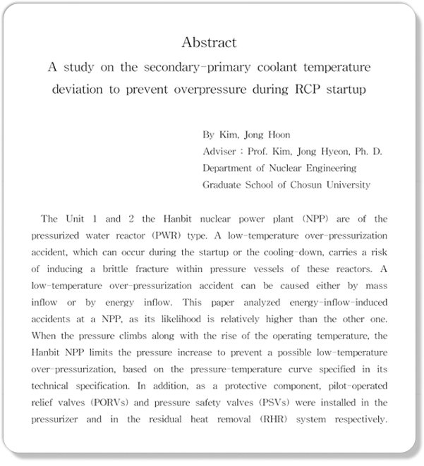 둘째, 열 유입시 압력 과도상태가 발생되지 않는 즉, 저온과압보호설비[잔열제거계통의 안전밸브(PSV) 또는 가압기 압력방출밸브(PORV)] 동작 설정값 이하에서 원자로냉각재계통 압력이 안정될 수 있는 증기발생기 2차측 냉각재와 1차측 원자로냉각재간 온도 차이를 과도상태분석과 현장 경험 값 분석을 통하여 산출하고 현장에 반영하여 발전소 안전운전에 도모하고자 한다