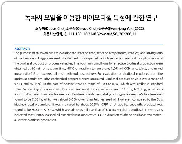 바이오디젤 생산을 위한 최적화를 위해 반응시간, 반응온도, 메탄올과 녹차씨유의 혼합 비율, 및 촉매에 대해서 검토하였다. 바이오디젤 생산을 위한 최적의 반응조건은 반응시간 50분, 반응온도 60°C, 촉매로서 KOH 1.0%, 녹차씨 오일와 메탄올의 혼합몰비 1:5로 각각 나타났다.