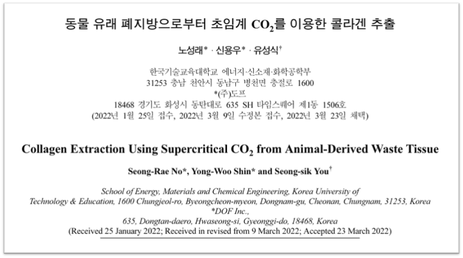그래서 폐기되는 동물 유래 지방으로부터 콜라겐을 추출하고자 한건데요, 지방 속에 숨어있는 콜라겐을 효율적으로 뽑아내기 위해 침투력이 좋은 초임계 용매 기술이 활용된 것이라 보시면 될 것 같아요!