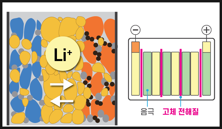전고체 배터리는 양극과 음극 사이의 전해질을 기존의 액체에서 고체로 대체한 배터리를 말해요. 이름 그대로 All Solid-state Battery가 된 것이죠! 기존의 배터리에 비해 발화나 폭발 위험이 없어 안전성이 우수하고 에너지 밀도가 높다는 장점이 있는데요, 특히 전기차 산업에서는 주행거리의 대폭 증가를 가능케해줄 꿈의 배터리로 불리기도 해요.