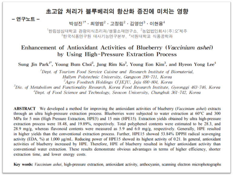 이번에 소개해드린 연구의 블루베리🫐도 항산화로 유명한 식품들 중 하나인데요, 초고압 추출로 블루베리 속 유효성분을 추출해봄으로써 기존의 열수추출 대비 수율과 활성성분의 용출 증가가 확인되었다고하니 긍정적인 활용을 기대해 볼 수 있겠죠?