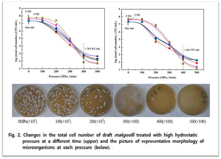 초고압 처리에 따른 막걸리의 생균수의 변화를 Fig. 2에 나타내었다. 시판 막걸리와 실험실에서 제조한 모든 막걸리에서 미생물이 지수적으로 감소되었다. (중략) 특히, 300MPa 이상의 압력에서는 대부분의 효모가 사멸되었으며, 400 MPa이상에서는 살아있는 효모가 관찰되지 않았다. 그러나 동일 압력에서 처리시간을 1분에서 3분으로 늘려보아도 생균수의 변화는 관찰되지 않아 막걸리의 미생물 제어는 처리시간보다 처리압력에 의존적인 것으로 확인되었다. (중략)