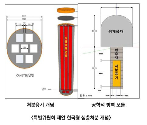 연구팀이 제안한 한국형 처분 솔루션은 화강암반의 스웨덴과 핀란드 방식과 개념적으로 동일하다. 다만 안전성을 확보하면서 비용을 줄일 수 있는 방식으로 처분용기 내부는 주철로, 외부용기는 3D프린팅 기술을 적용한 1cm두께의 구리 용기를 제안했다. 이를 통해 용기의 강도는 높이고 가격은 절반으로 낮출 수 있다. (중략)