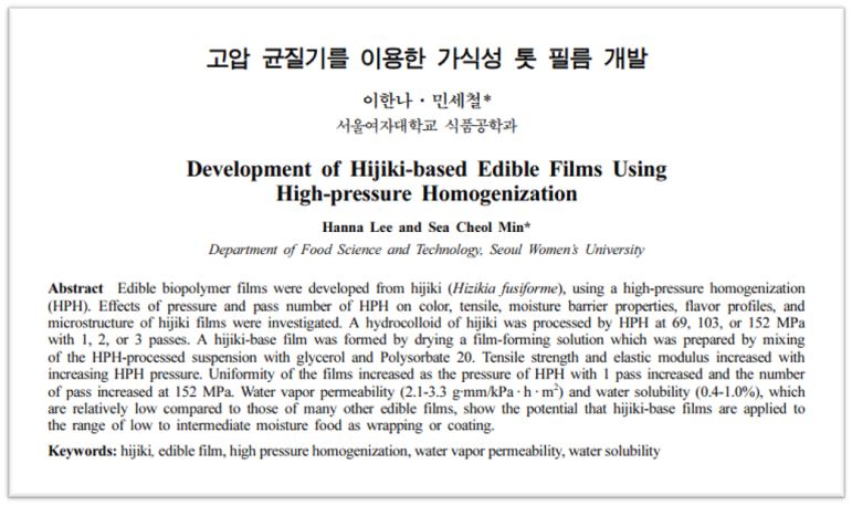 기존의 방법으로 가공한 해조류는 그 형태와 크기에 제한이 있어 식품에 보조 재료로 사용되는 경우 대부분 잘게 썰어 건조를 시킨 것을 첨가하는 정도로 사용되어 왔습니다. 따라서 더 많은 해조류의 식품 적용을 위해서는 해조류 고유의 형태와 크기에 제한 없이 여러 식품에 사용될 수 있는 식품 소재 개발이 요구된다고 하는데요. 그런 면에서 본다면 위 논문에서 소개하고 있는 고압균질기를 이용한 가식성 필름도 한가지 방법이 될 수 있지 않을까요?🤓