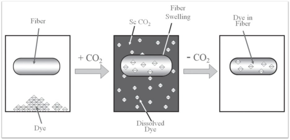 초임계 유체는 기체보다 용해력이 높고 액체보다 확산 속도가 빠르다. 또한 고분자를 용해하면서 팽윤(swelling) 시키는 특성을 가지고 있다. 이로 인해 합성섬유는 초임계 유체 내에서 쉽게 팽윤되어 분자량이 큰 염료가 침투하기 쉬워진다. (중략)