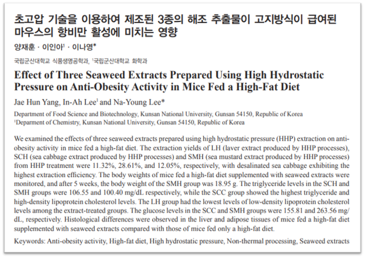 위 논문이 흥미로운 이유는 단순히 ‘해조류가 건강에 좋다’는 이야기를 넘어서 가공 방식이 기능성의 결과에도 영향을 준다는 사실을 실험으로 보여주었다는 데 있습니다. 같은 원료라도 어떻게 다루느냐에 따라 다른 결과가 나온다는 것! 특히 이번 연구에서는 초고압이라는 물리적 자극을 통해 기존 방식 대비 추출 수율, 체중 변화 등에서 개선된 효과를 보았죠.