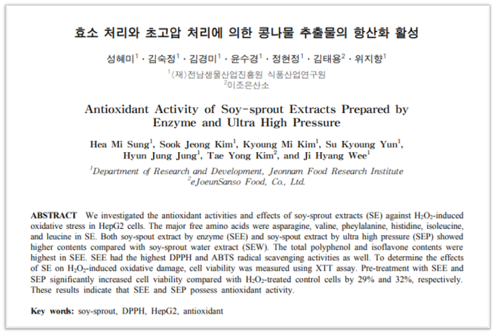 본 연구는 콩나물 처리방법에 따른 추출물의 항산화능 평가를 위해 콩나물을 초고압 처리, 효소 처리 및 무처리 후 물 추출하여 유리아미노산, 총 페놀, 이소플라본 함량을 확인하고 DPPH 라디칼 소거능, ABTS 라디칼 소거능과 HepG2 세포에서의 산화적 스트레스 방어 효과를 확인하였다. 또한 콩나물 처리방법에 따른 추출물의 총 페놀 함량 및 이소플라본의 함량은 효소 처리 추출물> 초고압 처리 추출물> 물 추출물 순이었다. (중략) HepG2 세포에서 H2O2로 유도된 산화적 손상에 대해서는 콩나물 효소 처리 추출물과 콩나물 초고압 처리 추출물이 콩나물 무처리 추출물보다 유의적으로 높은 세포보호 활성을 나타냈다. (중략)
