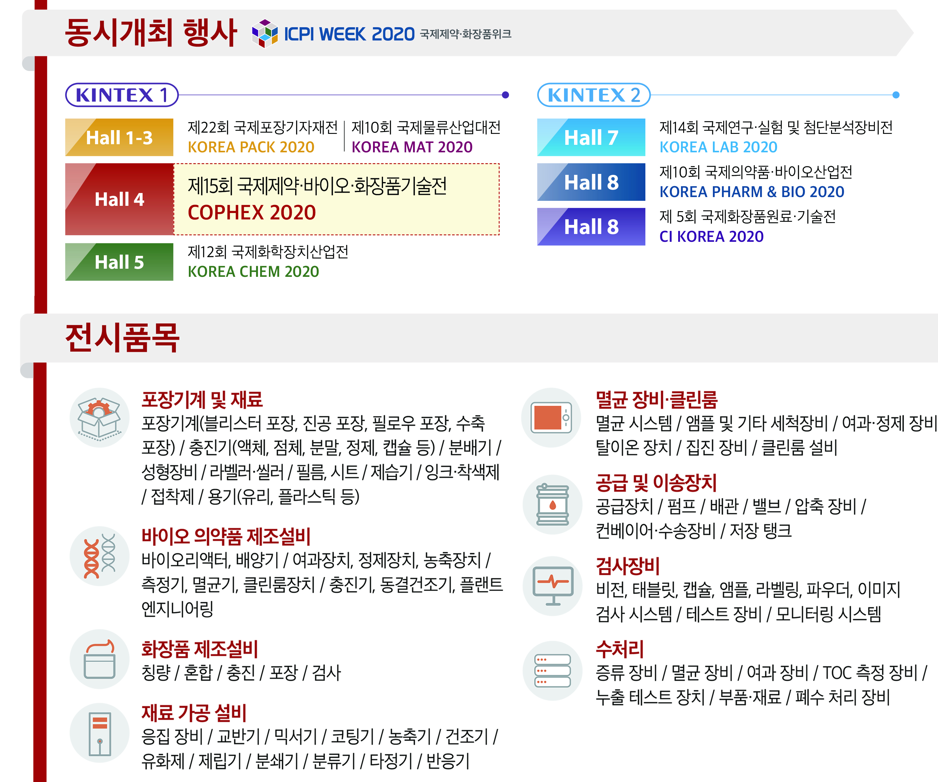 2020년 제 15회를 맞이하는 국제 제약·바이오·화장품기술전(ICPI WEEK 2020)은 산업통상자원부, 식품의약품안전처, 한국제약바이오협회, 대한화장품협회가 후원하고 경영전람이 주최하며 포장기계 및 재료, 멸균장비·클린룸, 바이오 의약품 제조설비, 물류 및 유통, 화장품 제조 및 설비, 재료가공설비 등의 다양한 분야를 한 곳에서 확인할 수 있는 동시에 세계적인 기업과 바이어가 참가하는 대규모 전시회입니다.