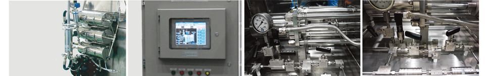 | 주요 특징 | - 일정한 가압과 순간처리 방식으로 제품의 물성변화가 없음 - 유압시스템을 적용하여 양산목적에 적합 - Interaction chamber에 막힘/응집 방지를 위한 Back Flushing Line - 플런져 횟수, 각 파트 별 온도 알람 설정으로 작동 중 오퍼레이터 부재 문제 발생시 정지 가능 |