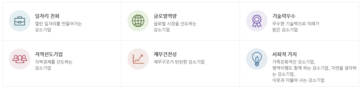 일자리친화, 글로벌역량, 기술력우수, 지역선도기업, 재무건전성, 사회적가치의 큰 유형들이 있습니다.