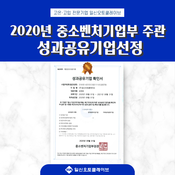 저희 일신오토클레이브가 중소벤처기업부에서 주관하고 있는 2020 성과공유기업에 선정이 되었습니다!