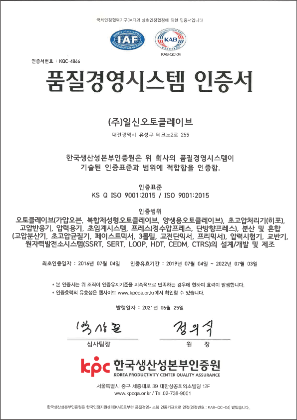 앞으로도 제품의 품질 향상을 위해 쉼없이 노력하는 일신오토클레이브 되겠습니다.