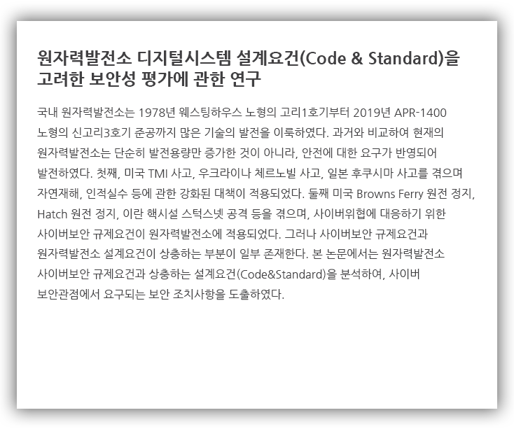 원자력발전소의 제어시스템이 디지털로 변화됨에 따라 사이버침해라는 새로운 위협이 대두되게 되었고, 일반적으로 원자력발전소 제어시스템은 외부와 연결이 되지 않은 독립된 망으로 구성되어 안전한 것으로 인식되었습니다.