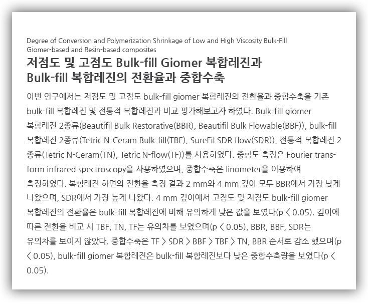 깊이에 따른 전환율 비교 시 TBF, TN, TF는 유의차를 보였으며(p < 0.05), BBR, BBF, SDR는 유의차 를 보이지 않았고, 중합수축 연구에서는 저점도 복합레진이 고점도 복합레진보다 중합수축량이 높았으며, bulk-fill giomer 복합레진은 bulk-fill 복합레진보다 낮은 값을 보였습니다.