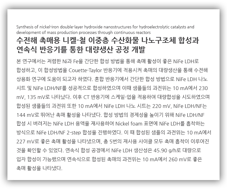 NiFe LDH의 촉매 활성을 높이기 위해 전기 전도성이 좋은 Nickel foam을 지지체로 이용하였고, 동일한 NiFe LDH 합성 조건에서 NaOH 처리한 NF를 넣어 MT 반응기에서는 1개의 NF가 합성되었고 CT 반응기에서는 스케일 업하여 20개의 NiFe LDH/NF 샘플이 합성되었습니다.