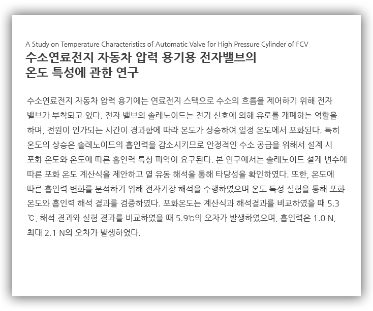 본 연구에서는 수소연료전지 자동차의 주행 안정성에 영향을 미치는 전자 밸브 솔레노이드의 온도 특성을 파악하기 위해 열 저항 등가법을 이용한 이론 모델을 제시하였고, 전산유체역학 소프트웨어를 활용하여 포화온도를 시뮬레이션하고 이론 모델과 비교 평가 하였습니다. 그리고 전자기장해석 소프트웨어를 활용하여 온도 변화에 따른 흡인력 특성을 시뮬레이션하고 실험 결과와 비교 분석하였습니다.